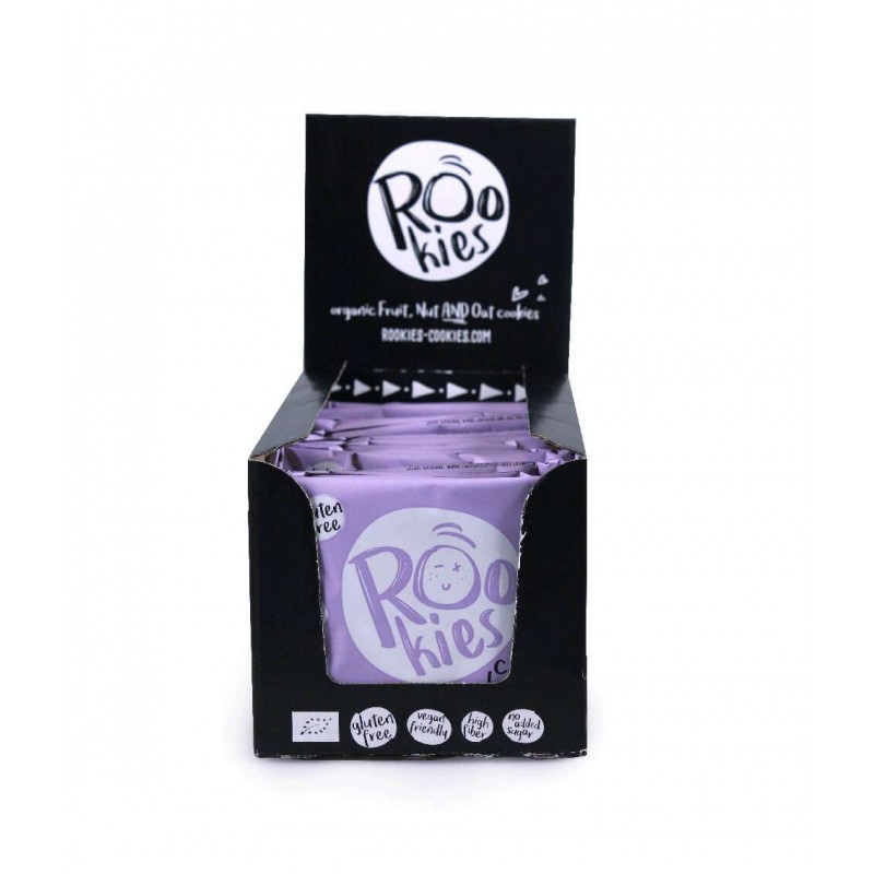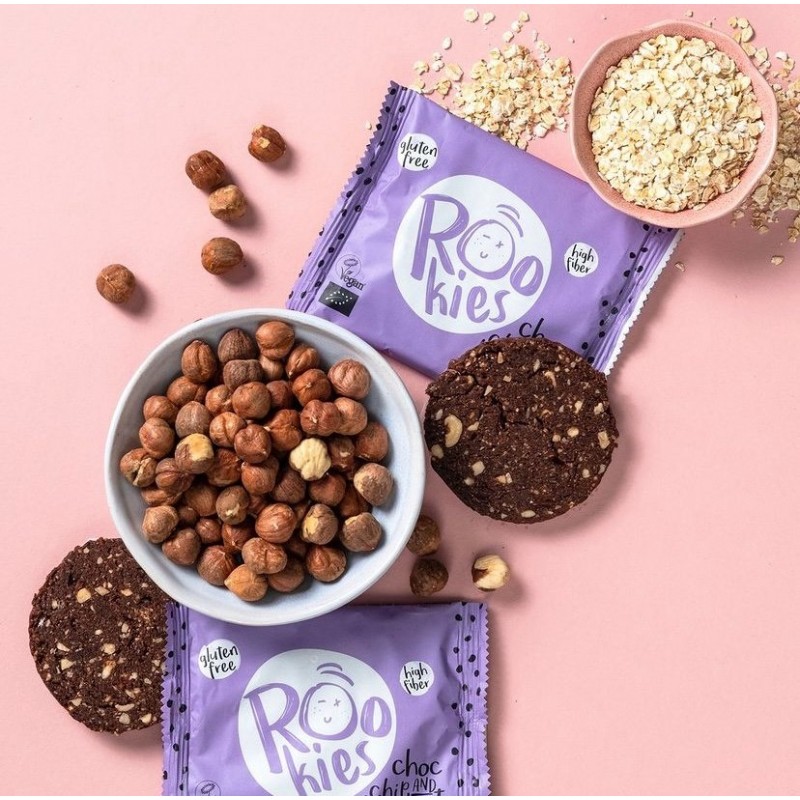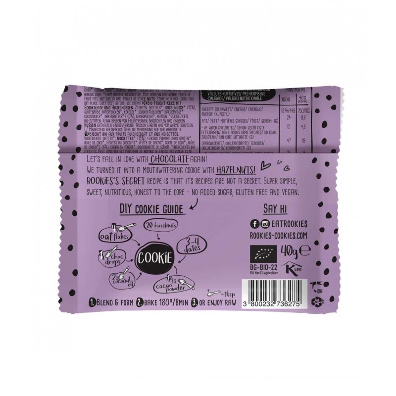 Ingredienti: Datteri*, nocciole*(15%), fiocchi di avena senza glutine*, olio di cocco*, sciroppo di datteri*, gocce di cioccolato*(6%) (massa di cacao*, zucchero di cocco*, burro di cacao*), cacao in polvere*, bicarbonato di sodio. * = Ingredienti da agricoltura biologica, ** = ingredienti da agricoltura bio dinamica.
